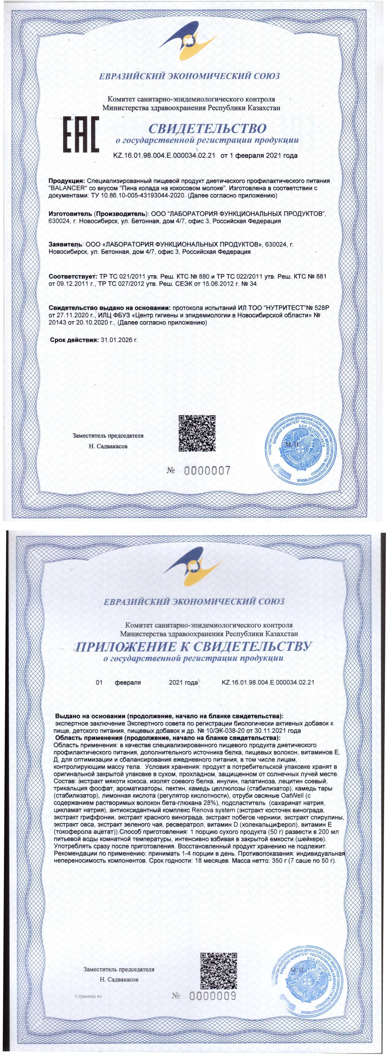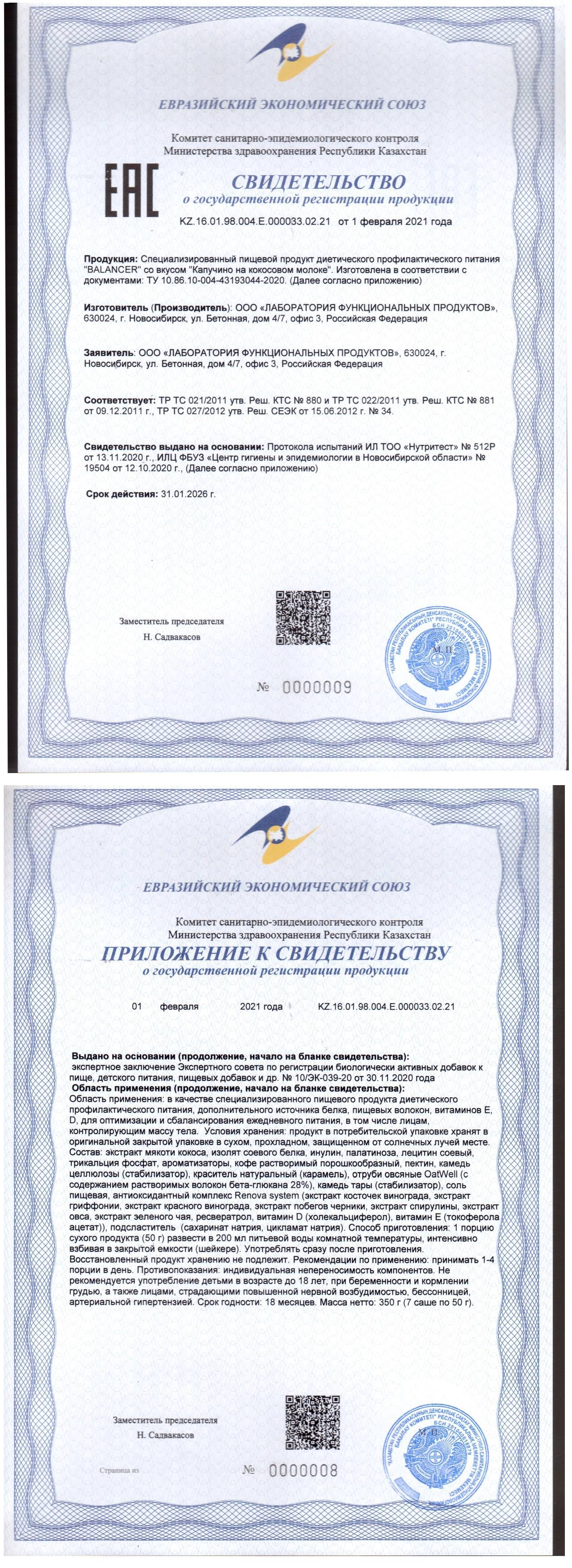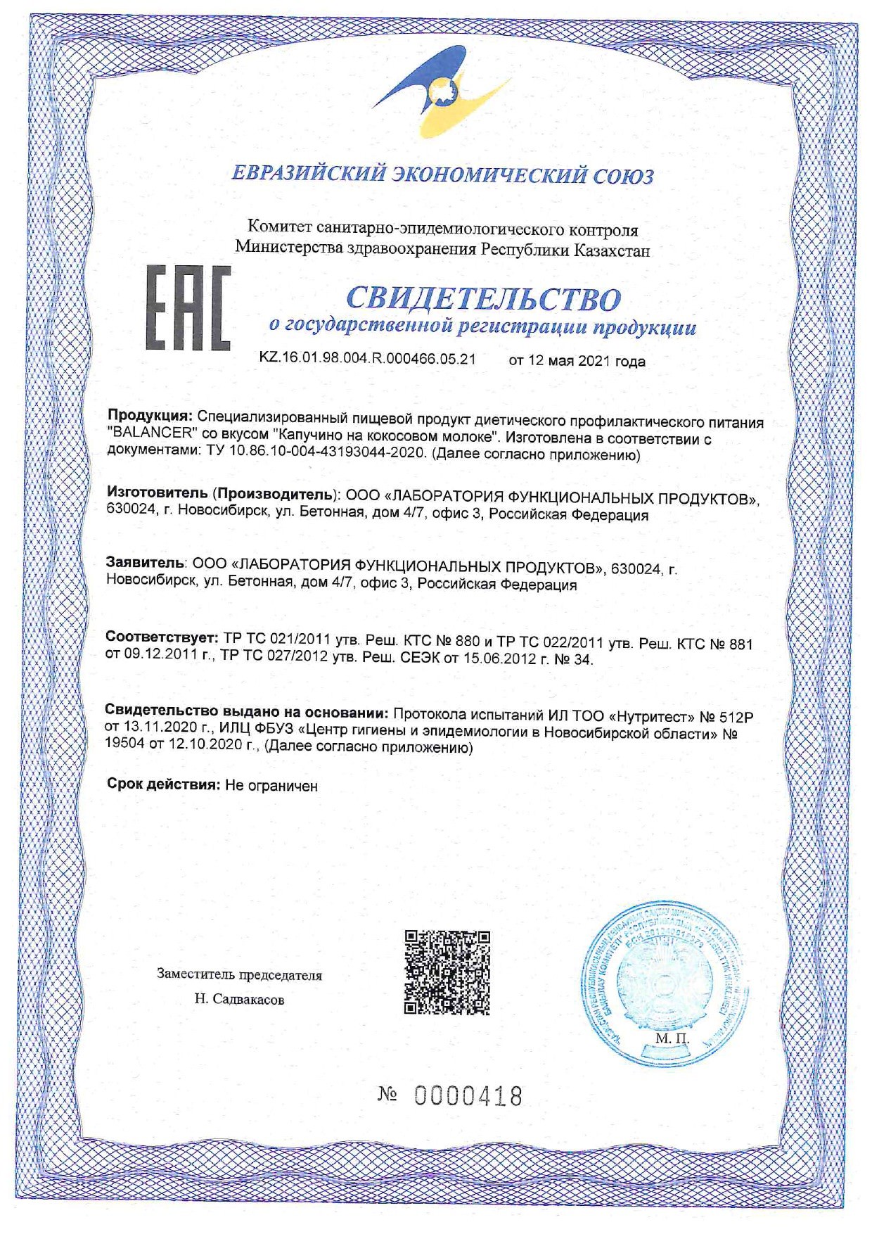 СПЕЦИАЛИЗИРОВАННЫЙ ПИЩЕВОЙ ПРОДУКТ ДИЕТИЧЕСКОГО ПРОФИЛАКТИЧЕСКОГО ПИТАНИЯ «BALANCER» СО ВКУСОМ «КАПУЧИНО НА КОКОСОВОМ МОЛОКЕ»