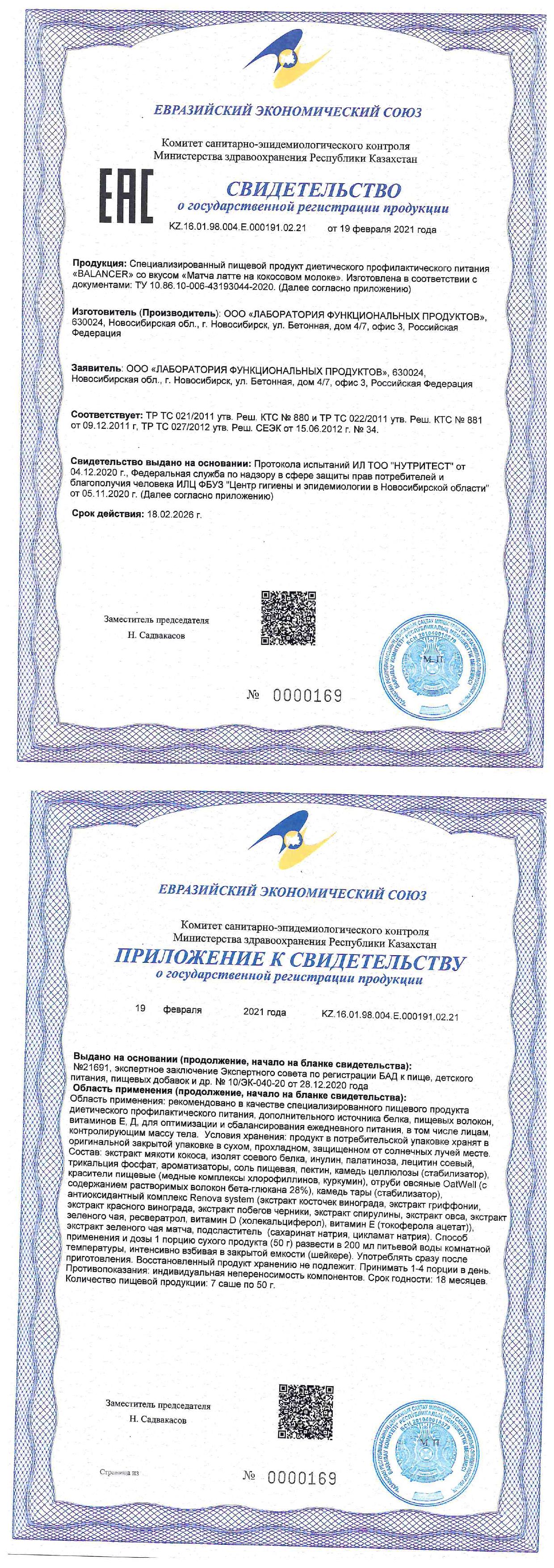 СПЕЦИАЛИЗИРОВАННЫЙ ПИЩЕВОЙ ПРОДУКТ ДИЕТИЧЕСКОГО ПРОФИЛАКТИЧЕСКОГО ПИТАНИЯ «BALANCER» СО ВКУСОМ «МАТЧА ЛАТТЕ НА КОКОСОВОМ МОЛОКЕ»