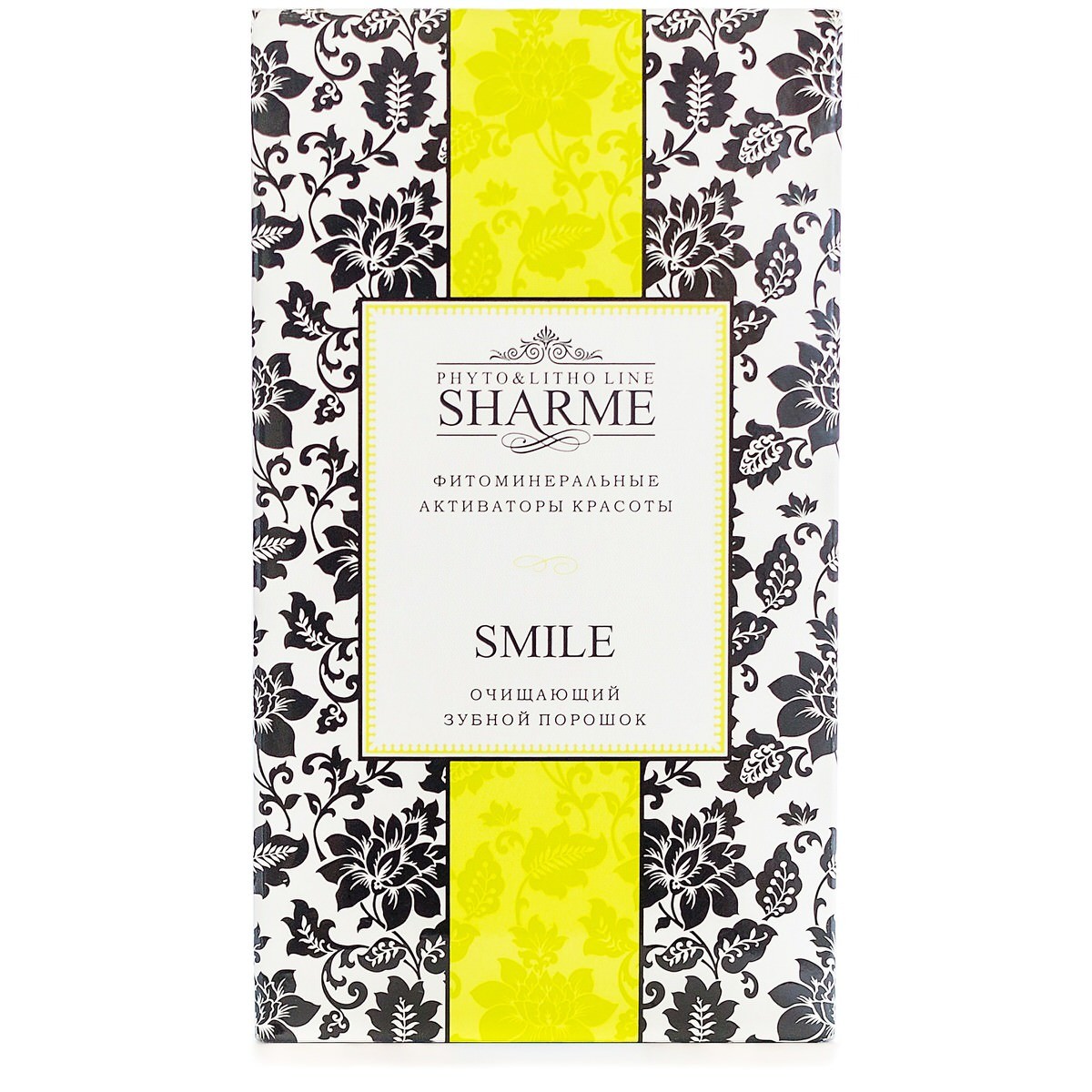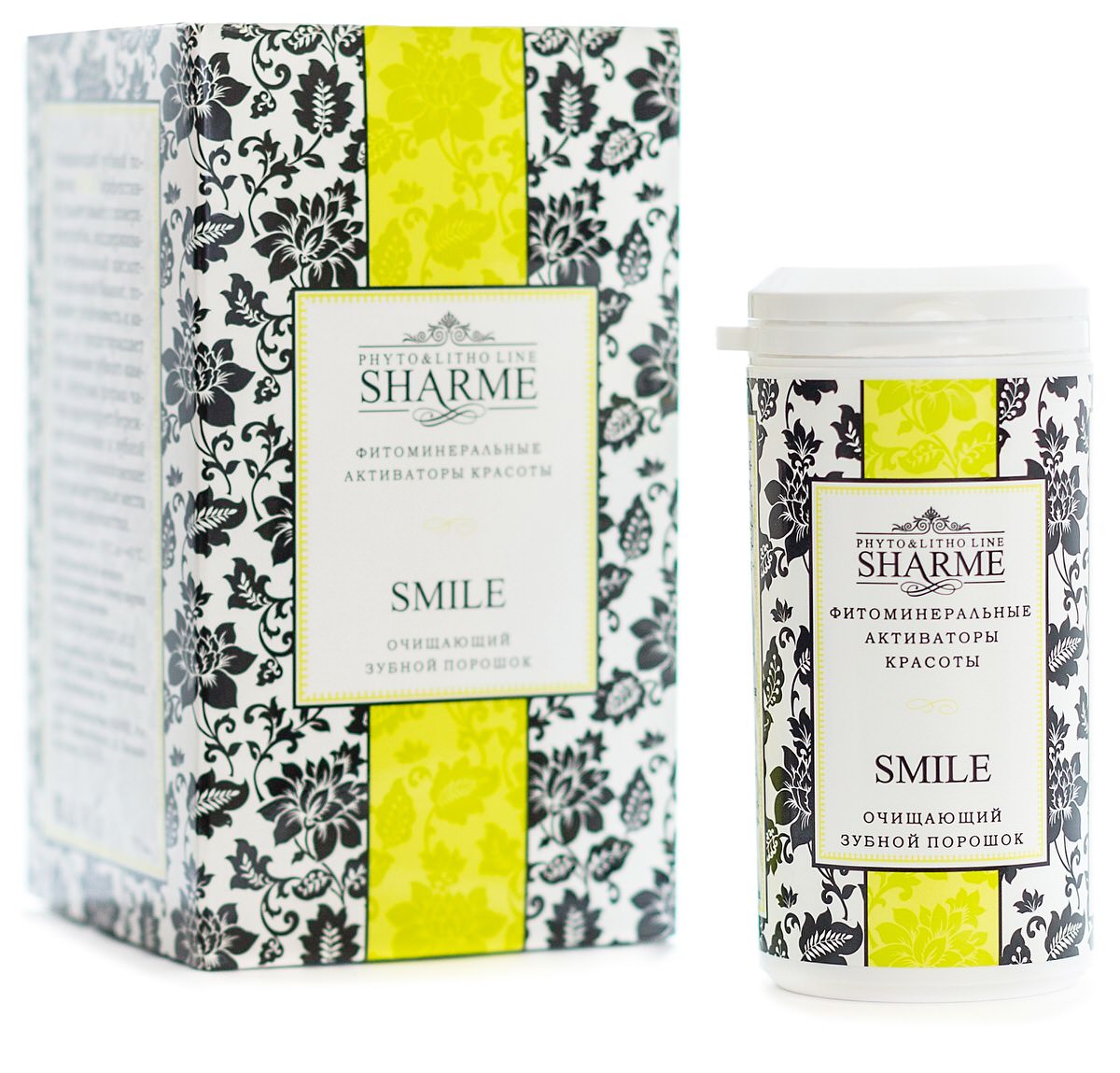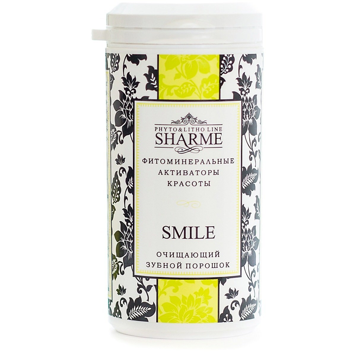 SHARME SMILE — 100 % натуральный продукт, который эффективно удаляет с поверхности зубов налёт от чая, кофе, табака и прочих окрашивающих веществ, предотвращает образование зубного камня, нормализует кислотно-щелочной баланс. Он укрепляет зубную эмаль, предотвращает развитие кариеса.