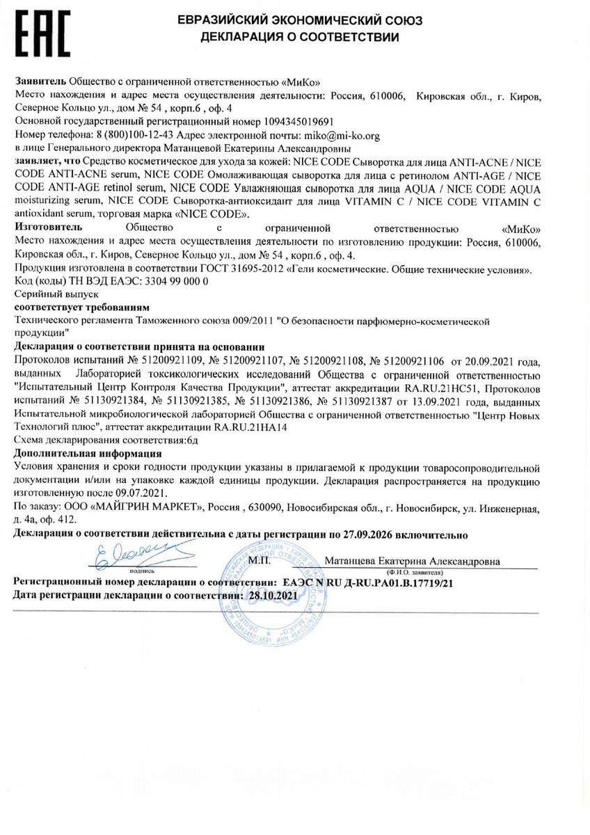 Благодаря уникальной композиции активных компонентов без использования искусственных консервантов, ароматизаторов и красителей, сыворотки NICE CODE помогают эффективно бороться с несовершенствами кожи и признаками старения, делая ее красивой и сияющей.